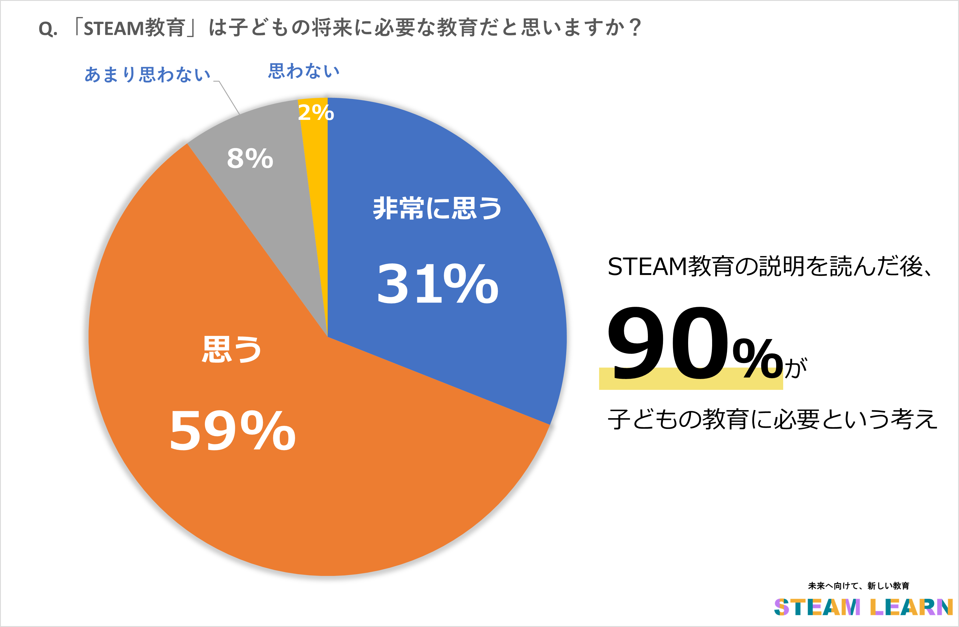 つまり、回答者の90%が子どもの教育に必要だと考えていることがわかり、STEAM教育に共感できるという結果が得られました。