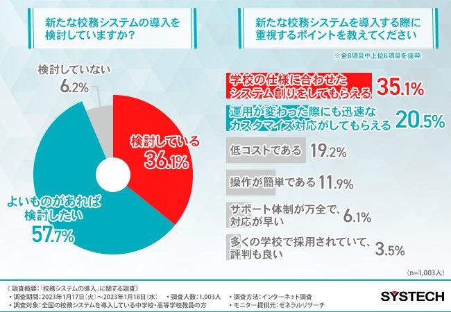 「新たな校務システムの導入を検討していますか?」と質問したところ、『検討している(36.1%)』『よいものがあれば検討したい(57.7%)』『検討していない(6.2%)』という回答結果になりました。