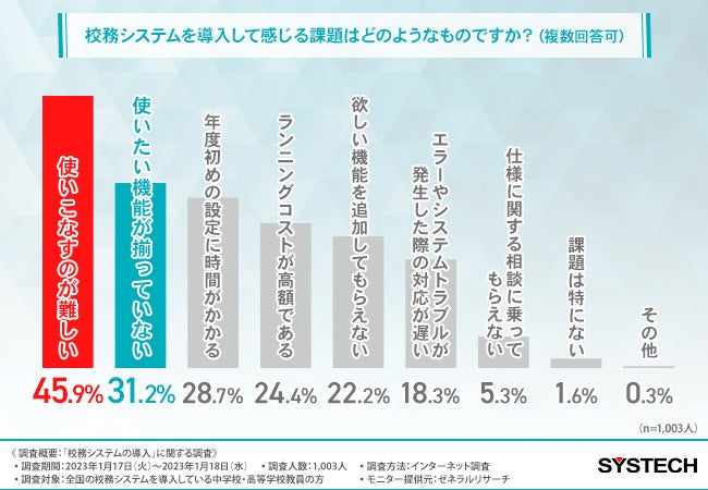 「校務システムを導入して感じる課題はどのようなものですか?(複数回答可)」と質問したところ、『使いこなすのが難しい(45.9%)』と回答した方が最も多く、次いで『使いたい機能が揃っていない(31.2%)』『年度初めの設定に時間がかかる(28.7%)』と回答しました。