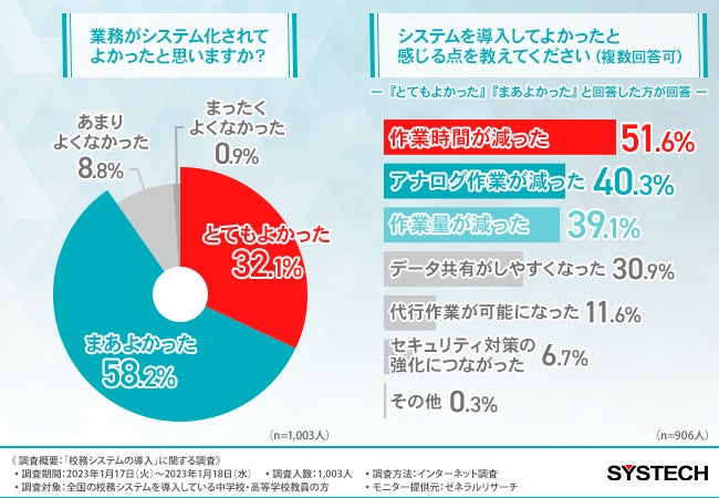 「業務がシステム化されてよかったと思いますか?」と質問したところ、9割以上の方が『とてもよかった(32.1%)』『まあよかった(58.2%)』と回答しました。
