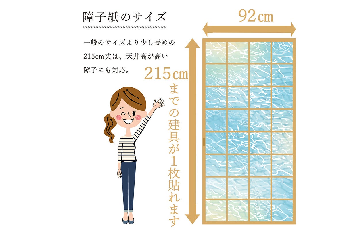 一般のサイズより少し長めの215cm丈は、天井高が高い障子にも対応。現在の居住空間に合わせ、幅広くご使用いただけます。天窓などの小さいサイズの障子と上下で合わせて貼れます。