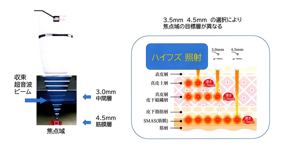文字通り超音波を応用した技術で、元はガン治療の技術を美容に応用した最新の技術です。ハイフは肌の奥にあるSMAS筋膜まで作用するのが特徴の一つ。たるみの原因はSMAS筋膜の緩みですが、そこに焦点を合わせてアプローチすることで、引き締め効果が発生。