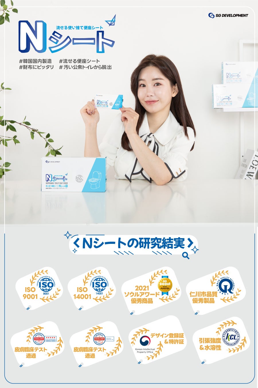 韓国の㈱SG開発で製造する流せる使い捨て便座シート「Nシート」が日本にリリースされた。