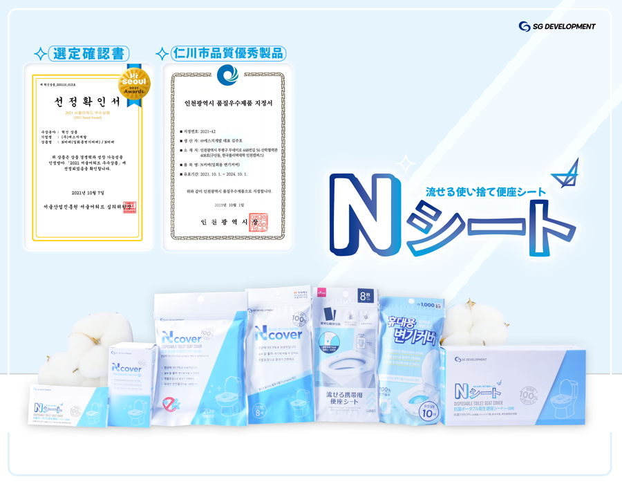 韓国の㈱SG開発で製造する流せる使い捨て便座シート「Nシート」が日本にリリースされた。Nシートは個別包装された抗菌使い捨て流せる便座シート商品で、韓国の㈱SG開発で製造・流通している商品である。