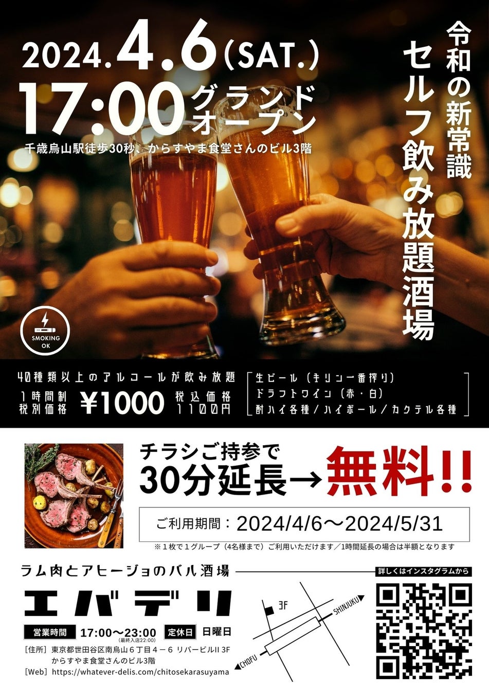【令和の新常識?!】1時間1100円(税込)で40種類以上のお酒がセルフで飲み放題!千歳烏山にバル酒場エバデリが2024年4月6日グランドオープン!