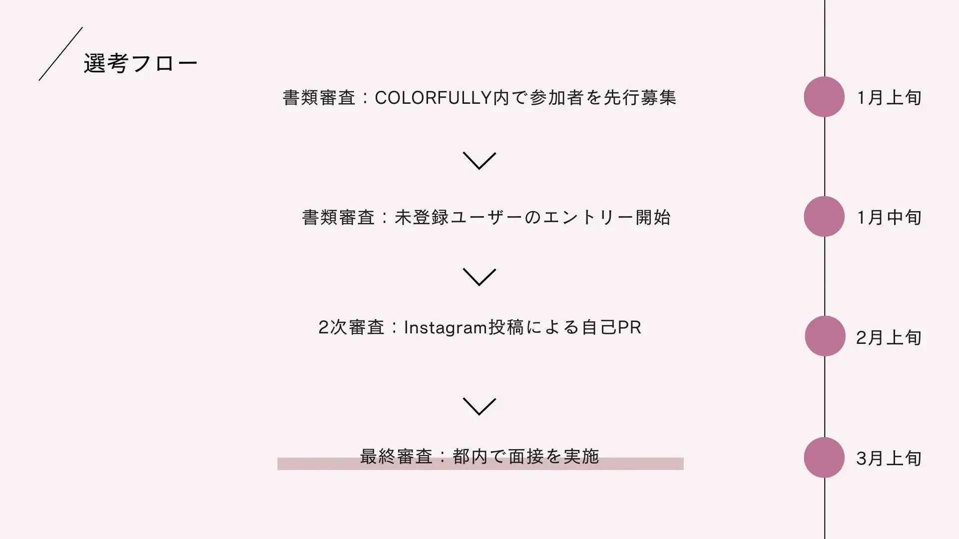 「COLORFULLY」に既にご登録いただいているユーザーを対象に、コンテスト参加者を先行募集。登録情報(プロフィール、宣材写真、SNS等)で選考を行います。