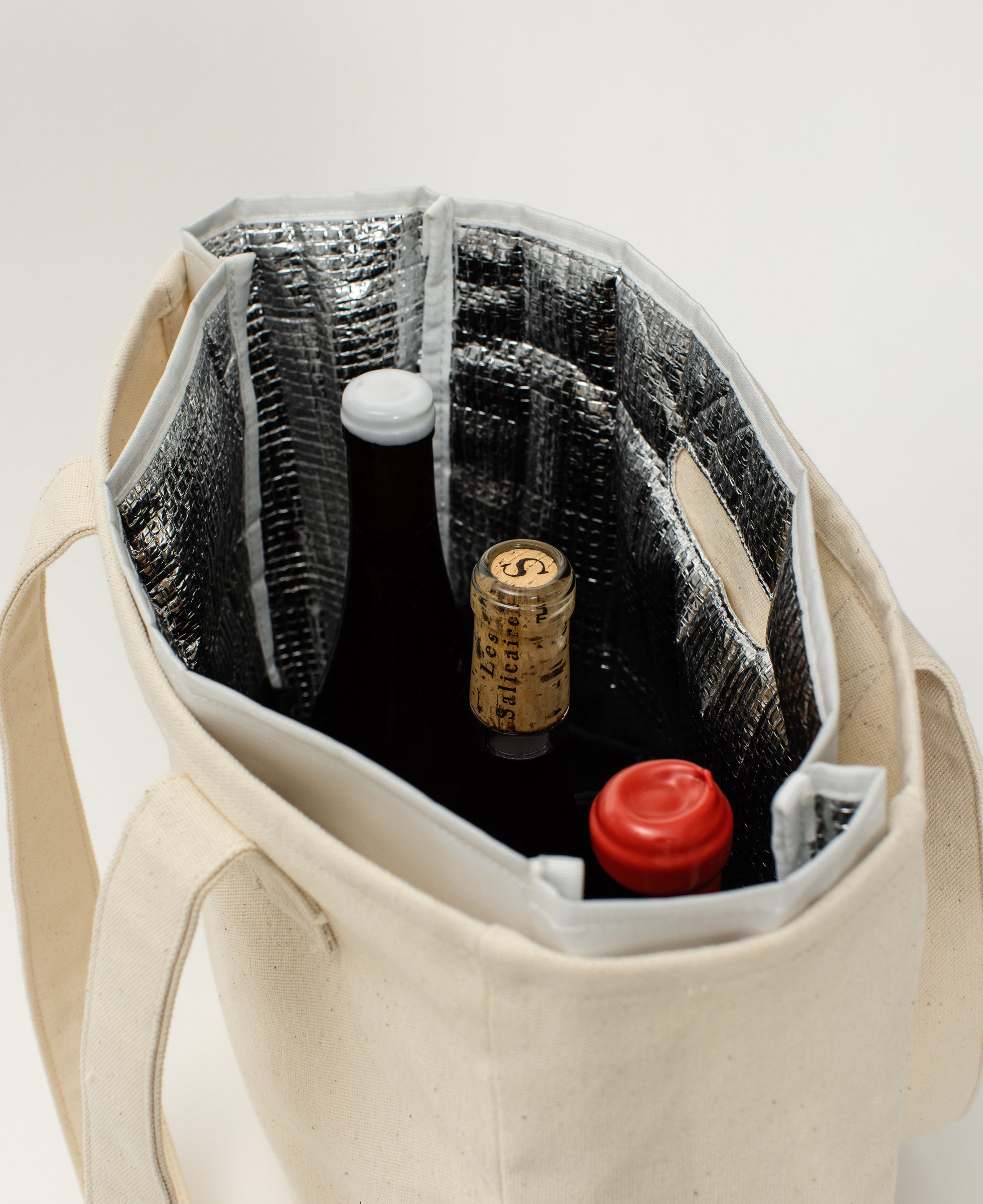 ワイン3本が間仕切りを使ってすっぽり入るトートバッグです。ワインを移動中も保冷するためインナーバッグにはアルミの保冷素材が使われ、しかも凍らせた保冷剤を入れるためのポケットが6つついています。インナーバッグは取り外し可能で外した状態ではレコードバックとしても使えます。デザインはイラストレーターChad a.k.a FONIKSが手がけています。