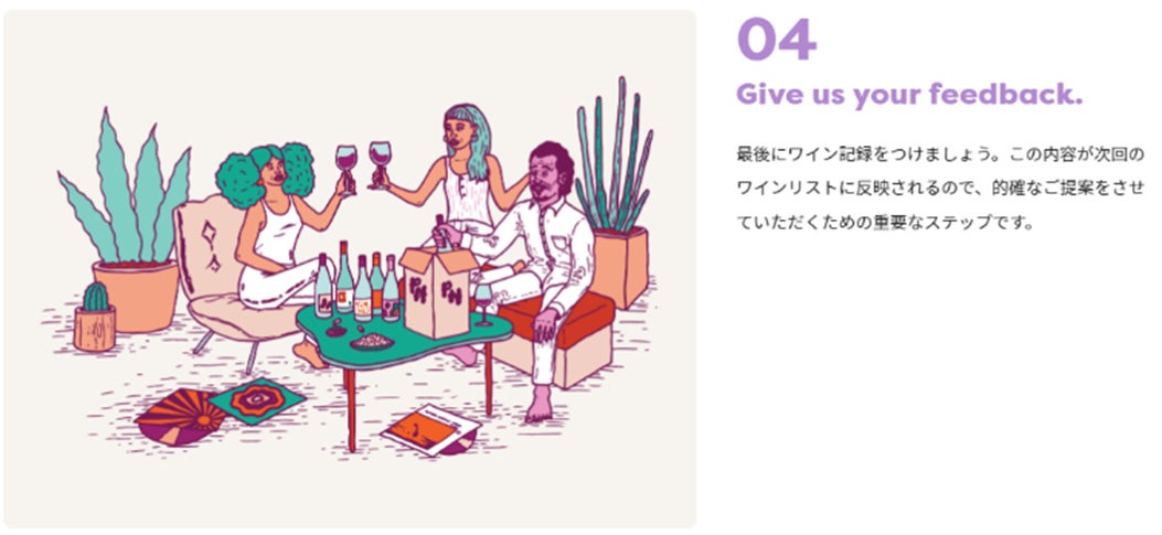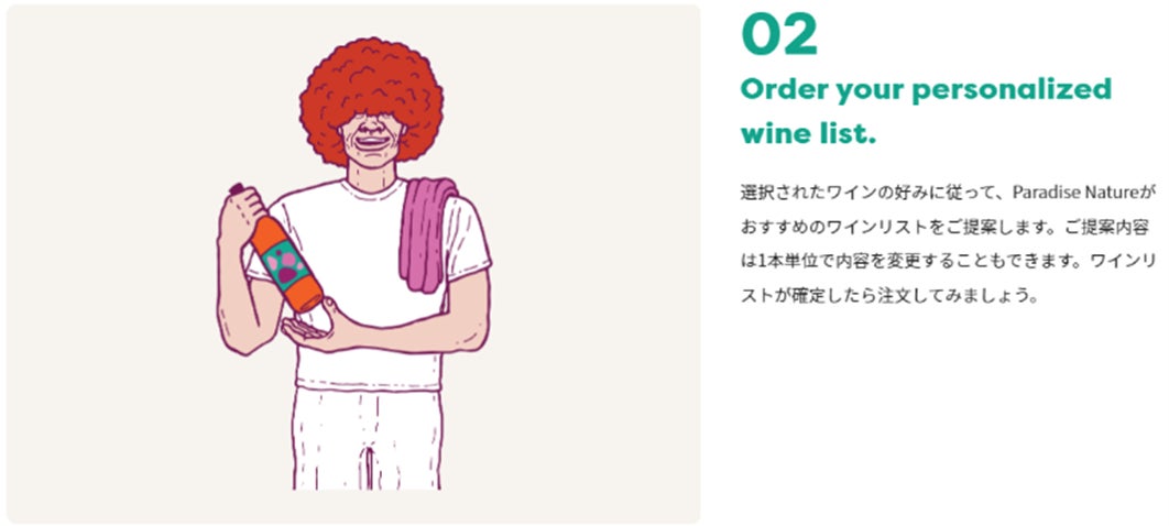 厳選されたナチュラルワインに特化し、最適なナチュラルワインをレコメンド。飲み続けることで的確に自分好みのワインを毎月お届けするサブスクリプションサービス