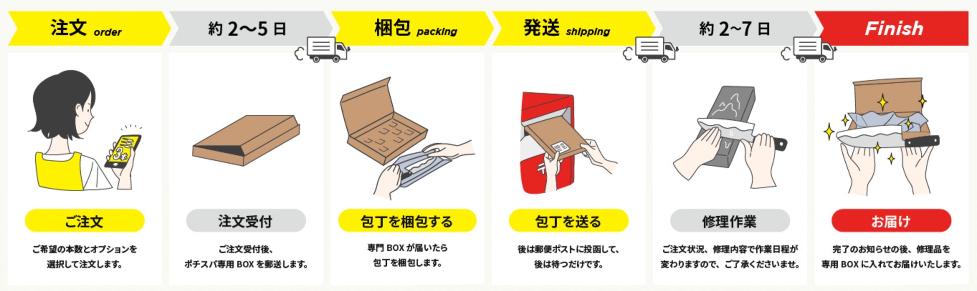 ポチスパとは、ネットでポチッと注文するだけで、専門の包丁職人があなたの包丁をスパッとした切れ味に研いでくれる、包丁研ぎ宅配サービスです。利用フローも以下の通りとても簡単で、注文後に発送されてくる箱に包丁を入れて送り返すだけ。これまでに50万本の修理実績がございます。