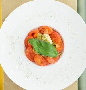 糖度の高いトマトにモッツアレラのコクと塩味を融合させました。味わいも酸味とのバランスのよい爽やかな前菜です。