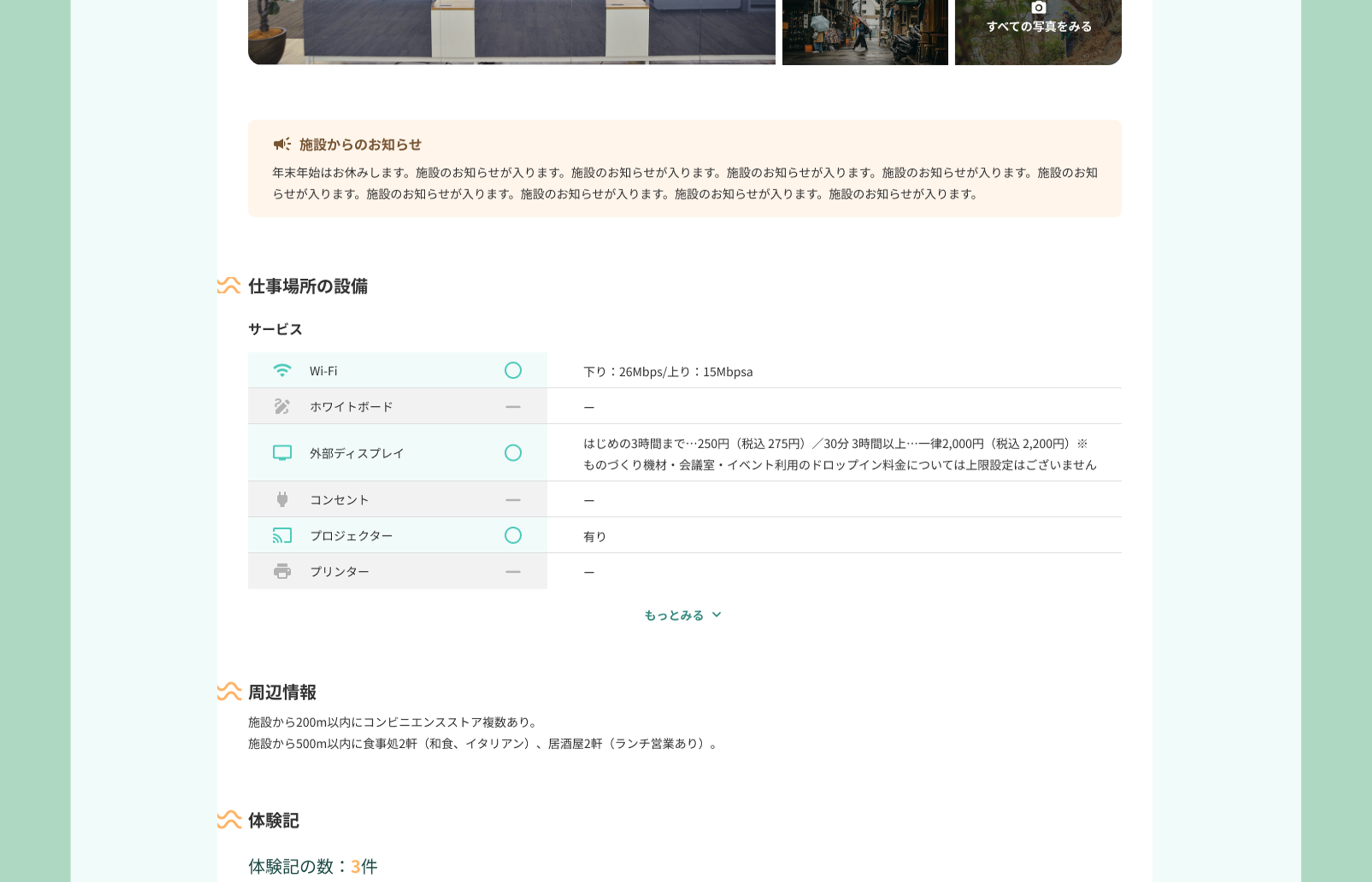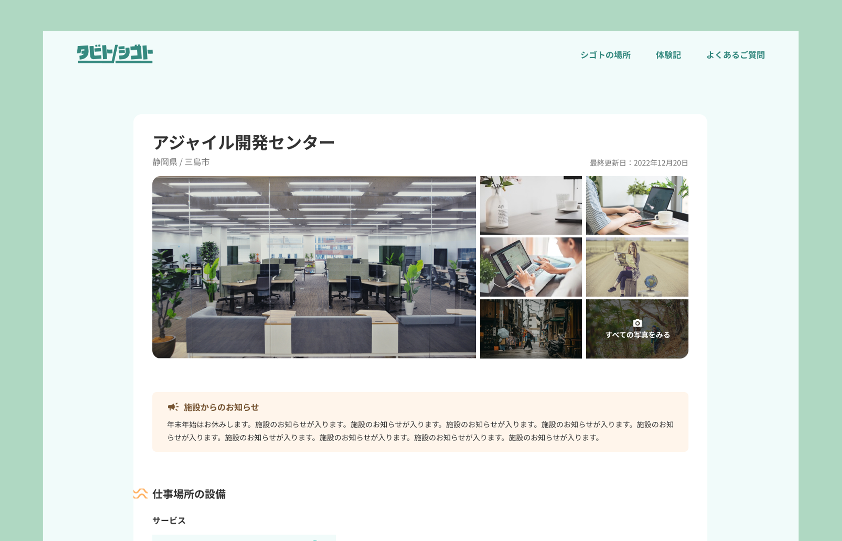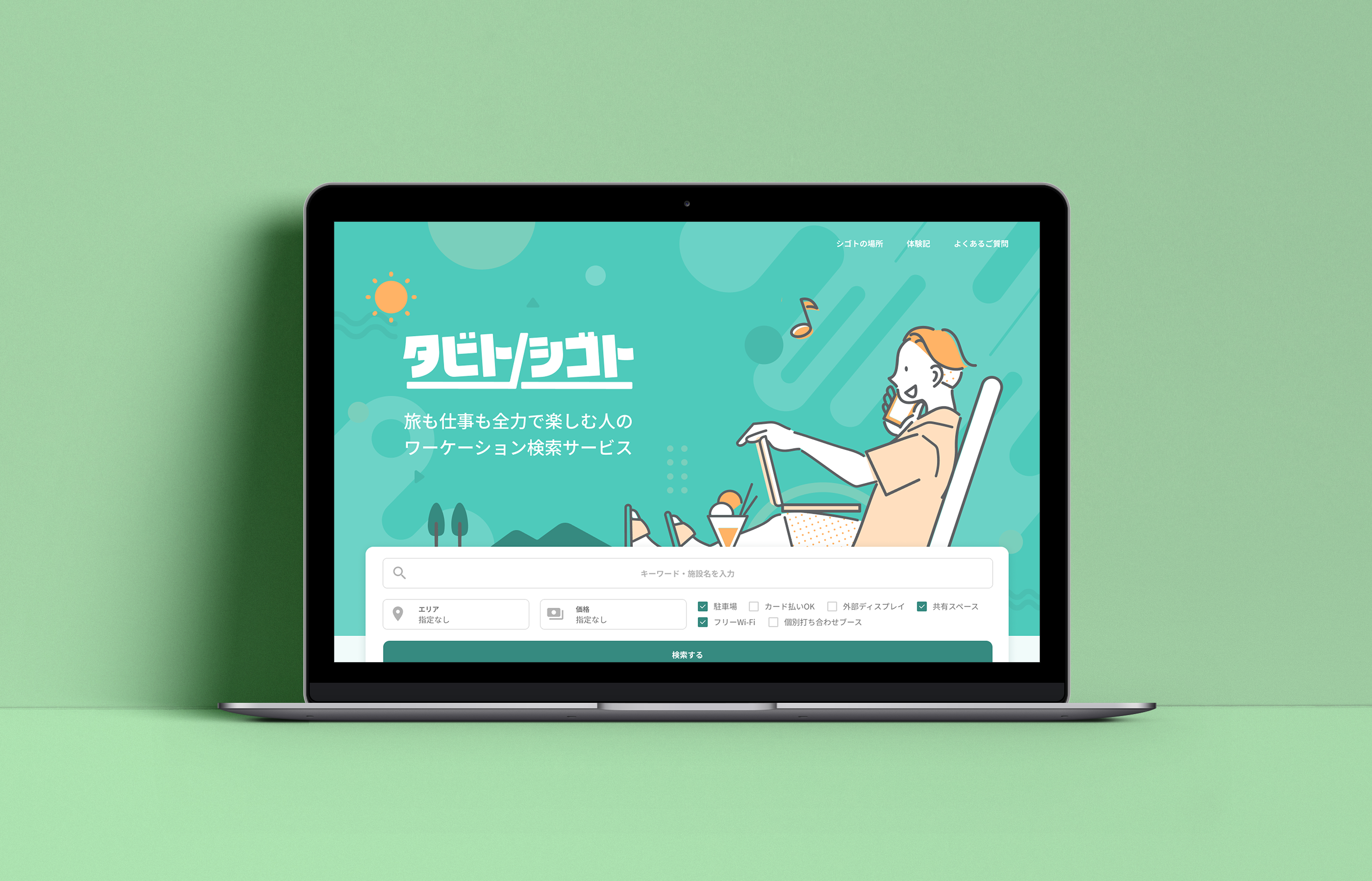 「タビトシゴト」は、旅も仕事も全力で楽しむ人のためのワーケーション検索サービスです。宿泊する施設の環境や設備情報、滞在先のワークスポットなどしっかりと仕事も行うために必要な情報を提供し、ユーザーがワーケーションを実施する際に具体的なイメージを掴むサポートすることで、ユーザーの不安を軽減、よりワーケーションを行いやすくすることを目的としています。