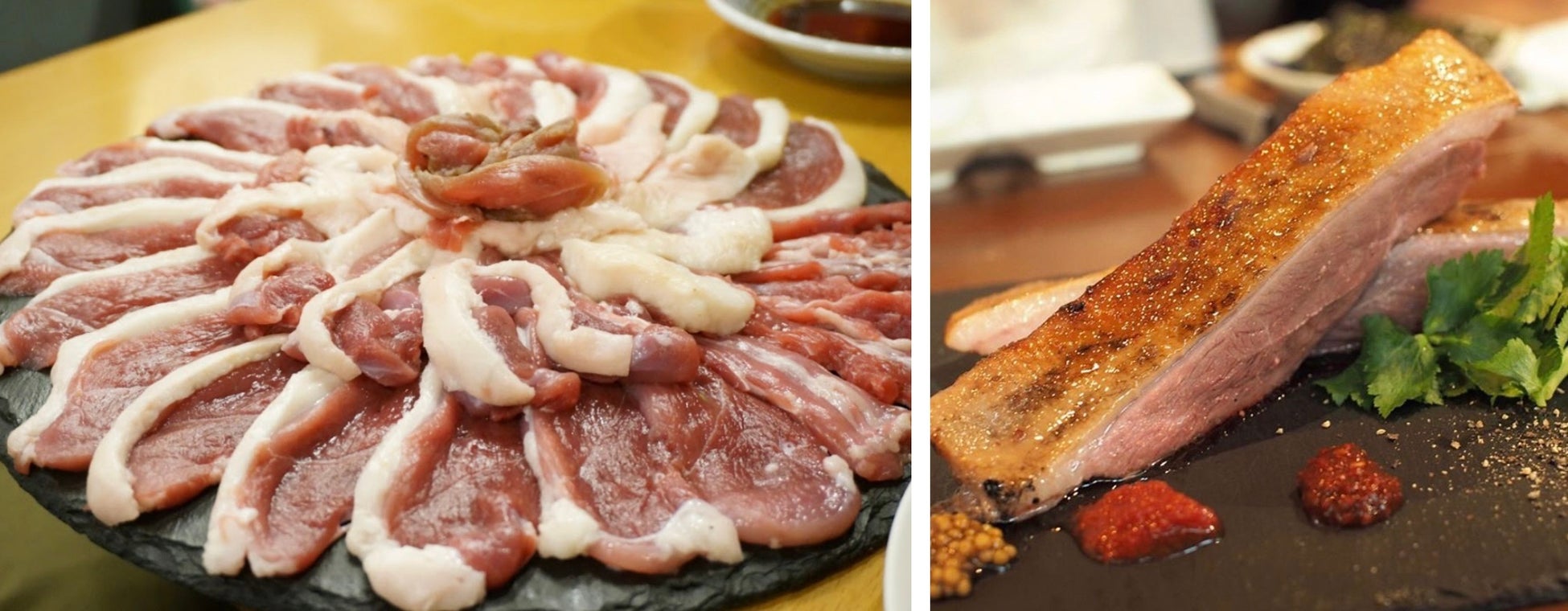 ・合鴨のロースト(写真右):ジューシーな肉質と脂の旨味を存分に楽しんでいただける仕上がりとなっています。