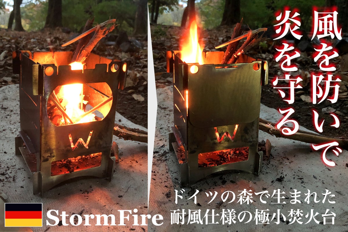 ソロキャンパーから支持を集めているコンパクト焚火台は、強い風に弱いのが困り事。それを解決したのが、防風仕様の「StormFire」です。燃焼口にプレートを被せるだけで炎を守り灰の飛散を防ぎます。質実剛健、頼もしいドイツ製。クラウドファンディングCAMPFIREにて1月28日より公開!
