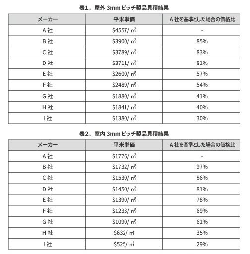 調査結果が表1,2になります。同じ屋外3mmピッチ製品、同じ室内3mmピッチ製品にも関わらず最も高いメーカーと最も安いメーカーでは3倍以上の価格差があることがわかります。各メーカーそれぞれしのぎを削っているとは言え、非常に大きな価格差です。