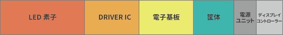 LEDディスプレイの価格の構成は大きく分けると【LED素子】【DRIVER IC】【電子基板】【電源ユニット】【筐体】【LEDディスプレイコントローラー】の6つの要素になり、それぞれの価格に占める割合は下図のイメージのようになります。
