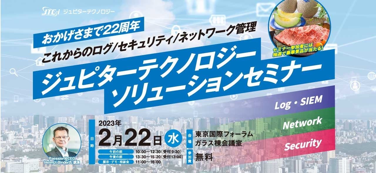 ジュピターテクノロジー株式会社(本社:東京都府中市、代表取締役:石川 幸洋、以下ジュピターテクノロジー)は、創立22周年の節目に際し、2023年2月22日(水)に「ジュピターテクノロジー ソリュ―ションセミナー」を東京国際フォーラムにて開催いたします。