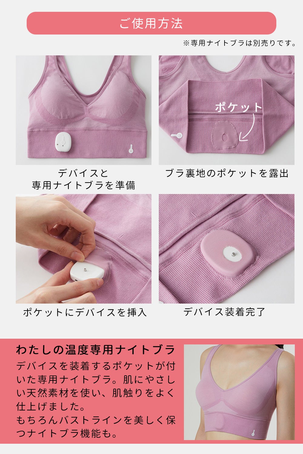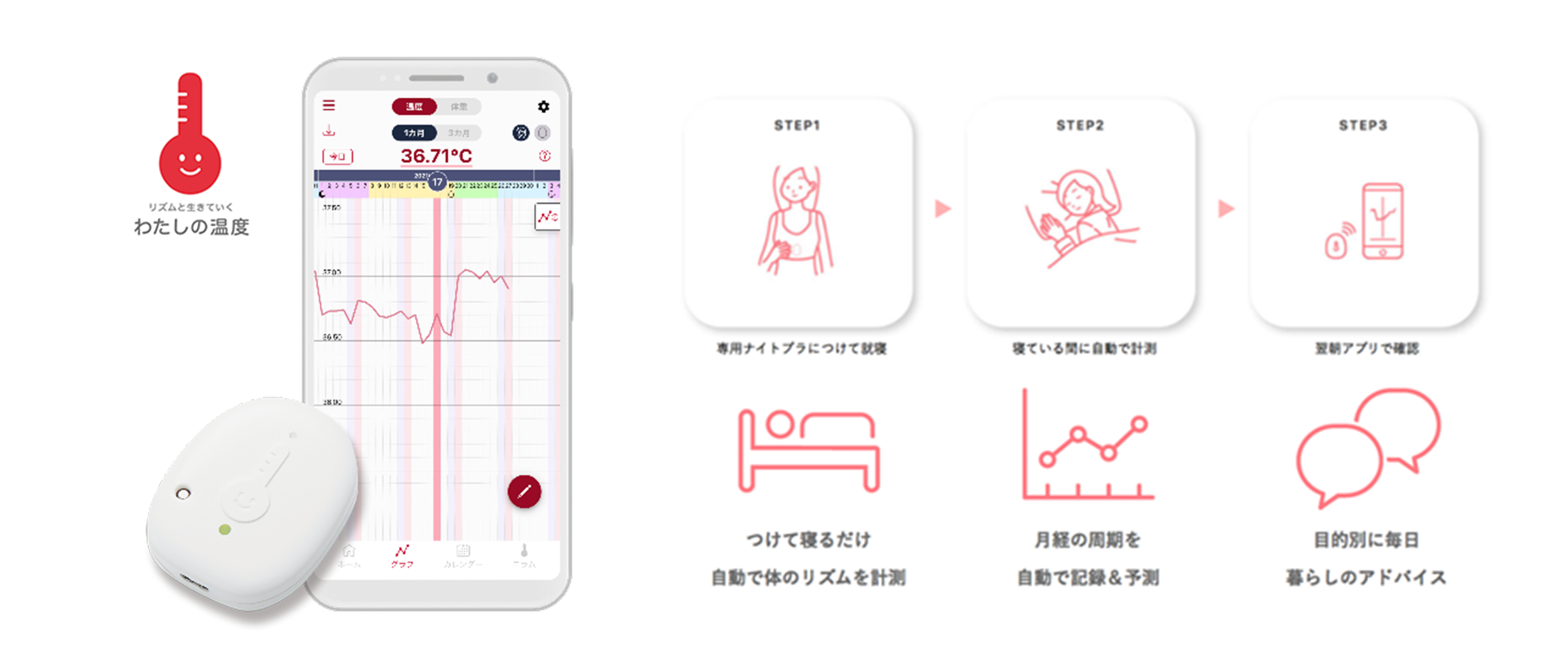 「わたしの温度」は専用ナイトブラのポケットに入れたウェアラブルデバイスが、寝ている間に女性特有の高温期・低温期を計測します。データはスマートフォンに自動連携され、起床時に測定データと履歴、周期予測などをアプリケーションで確認できます。