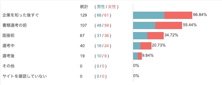 また、採用サイトを確認するタイミングとしては「企業を知った後すぐ」「書類選考の前」が最も回答が多いことも判明しています。