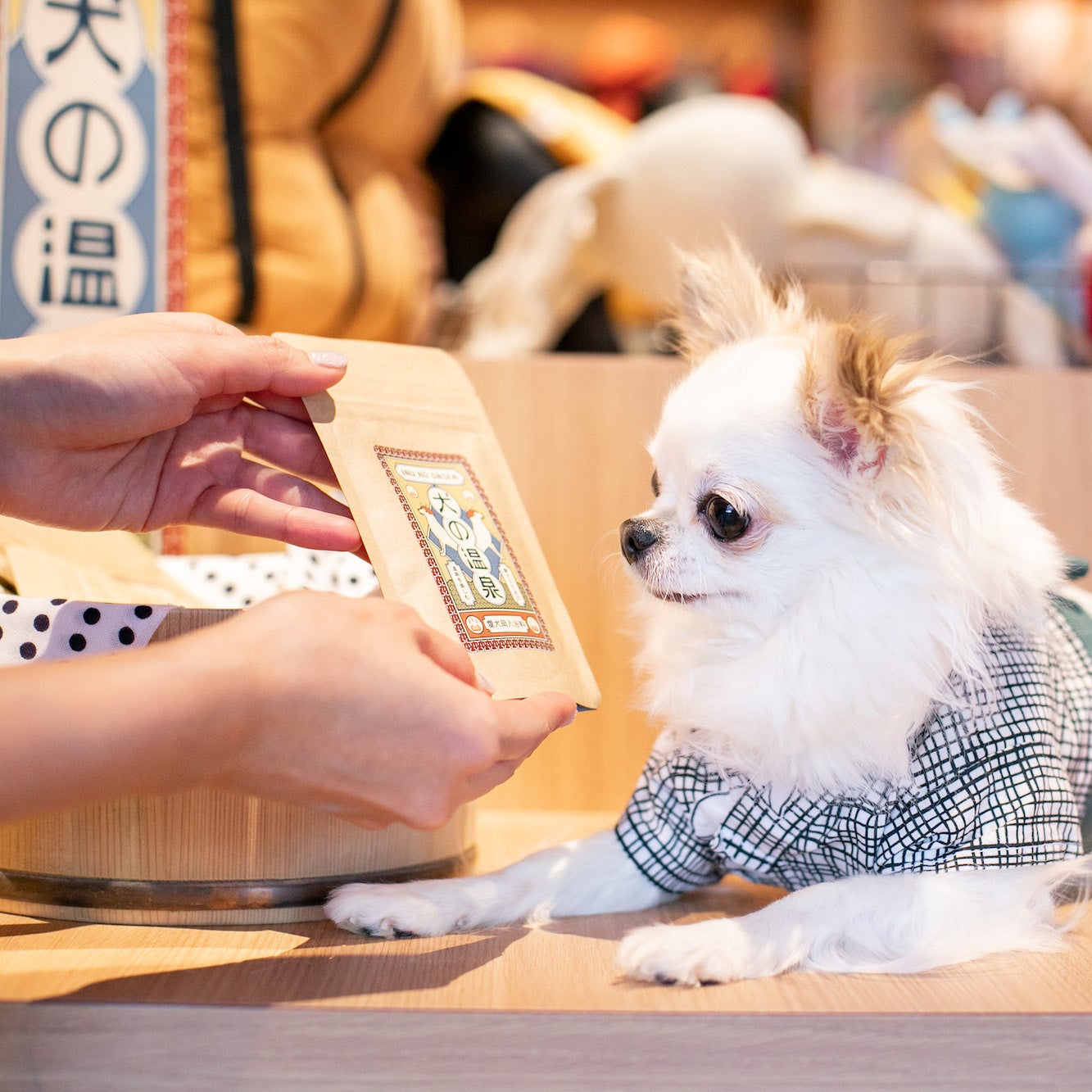 ◇コース内容:初回:犬の温泉 50g + 豆絞り手拭い + アヒルのおもちゃ 2回目以降:犬の温泉300g