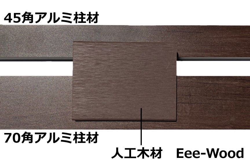 人工木材Eee-Woodとの馴染みもよく、アルミ柱材と人工木材を並べてみてもテカリなどはもちろんなく、自然な木の風合いたっぷりな見た目です。