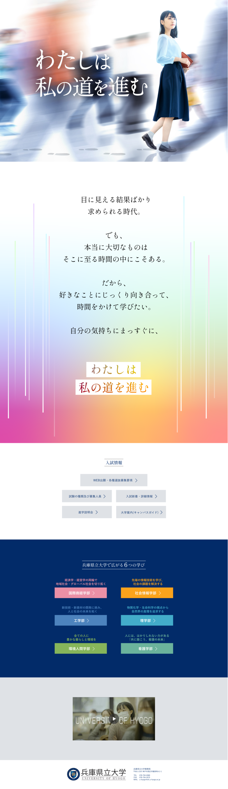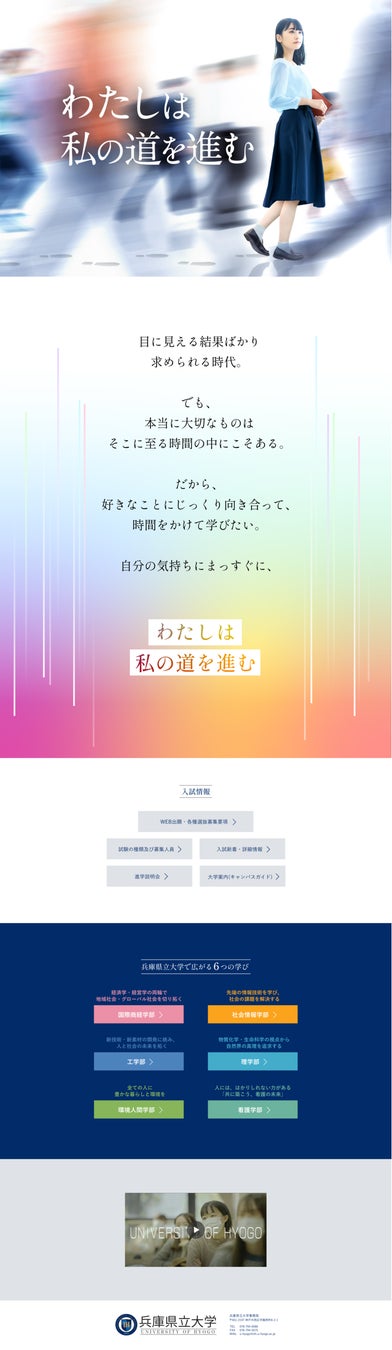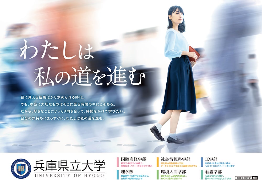 近年ますます強くなる結果を性急にもとめる風潮が、教育の世界にも浸透しつつあるなか、学生の本質的な成長のために必要な時間を大切にし、「時間をかけて学びたい」という学生の気持ちを応援したいという想いのもと、兵庫県立大学は、「わたしは私の道を進む」をメインメッセージとしたポスター・デジタルサイネージ動画を制作し、特設サイトを開設しました。