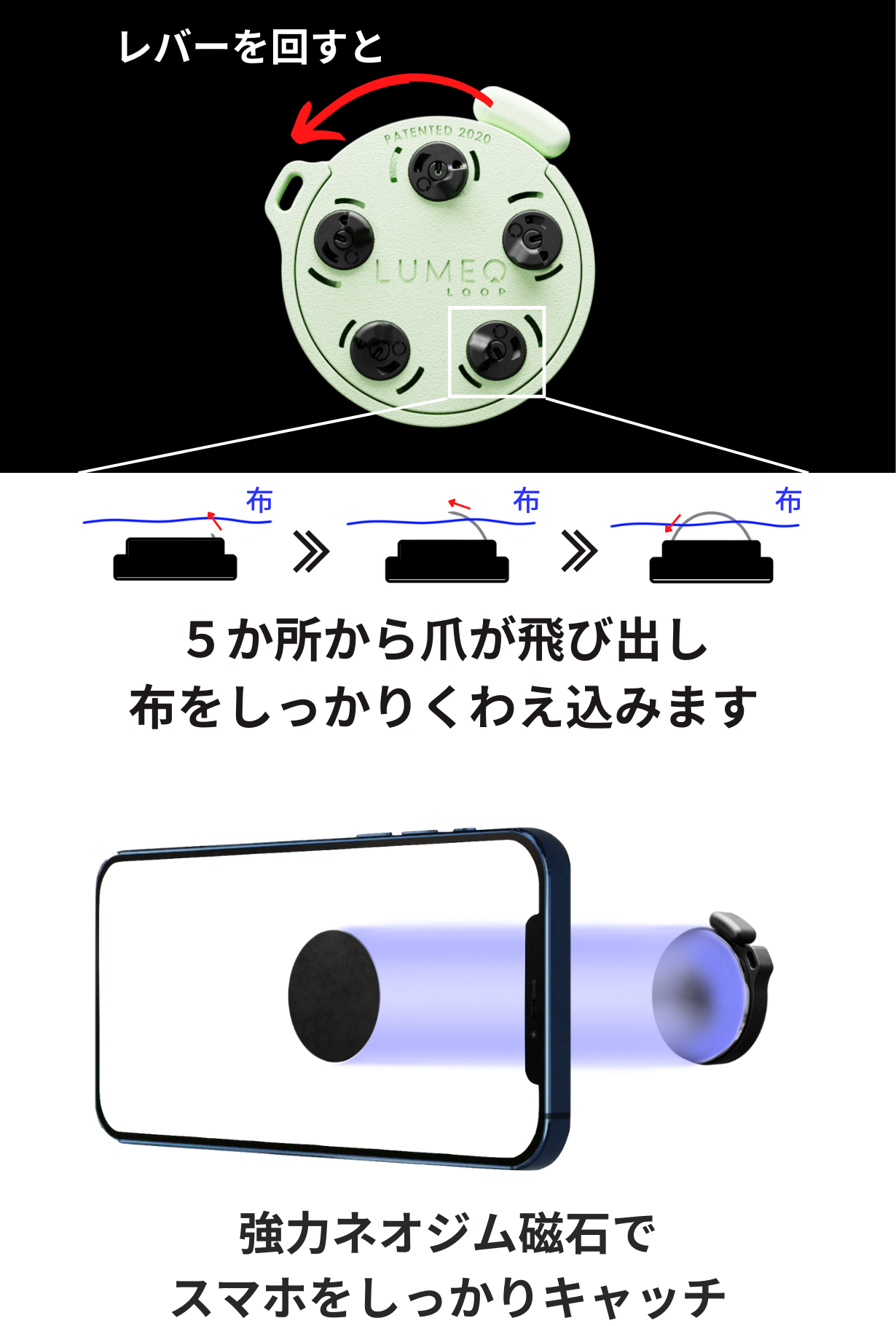 使い方は、布面にMoMagを付けて、スマホをMoMagに付けるだけ!