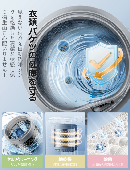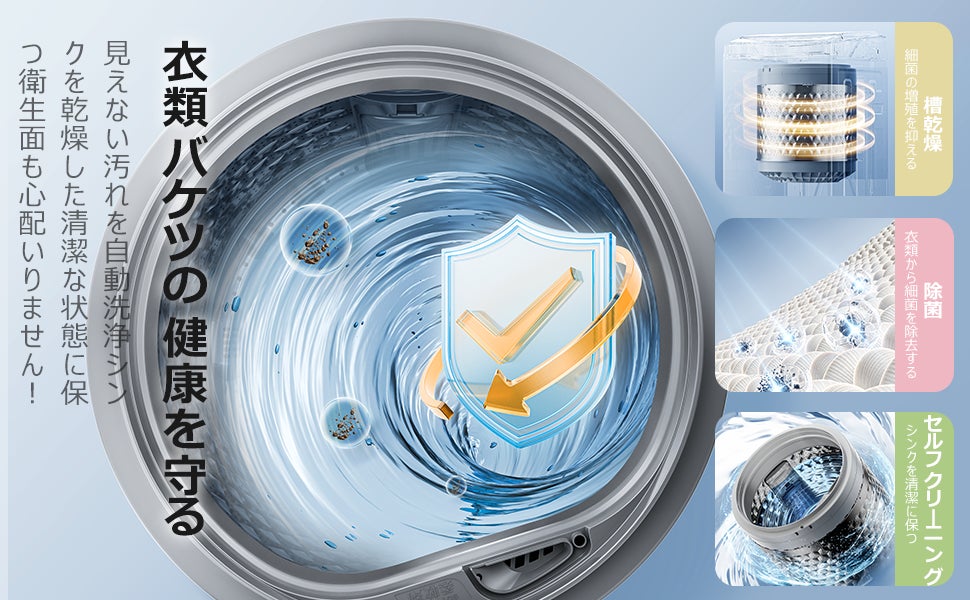 見えない汚れを自動洗浄し、シンクを乾燥した清潔な状態に保ち、衛生面も心配ありません。これにより、衛生面での懸念を全く抱くことなく、安心してご利用いただけます。さらに、自動セルフクリーニング機能により、洗濯槽の清潔さは常に保たれます。また、槽乾燥機能が洗濯槽内の細菌の増殖を効果的に抑制します。これらの機能は、いつでも最高の洗濯環境を提供し、お客様の健康と衛生を第一に考えた結果です。