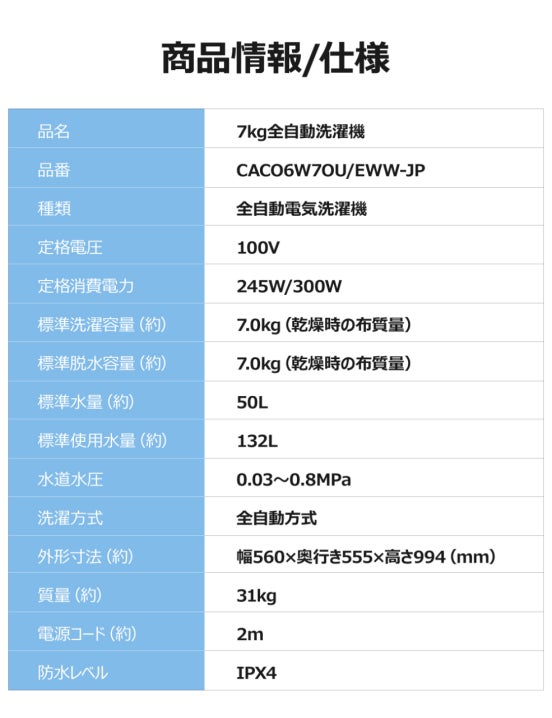 「Comfee’ 7kg 全自動 洗濯機」商品仕様