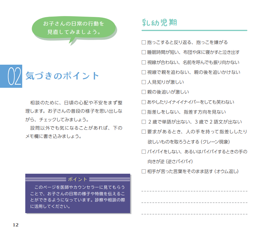 「子供の発達障がいに早く気づいてあげたい。」この本は障がいの適時発見と適時療育のためのサポートブックです。