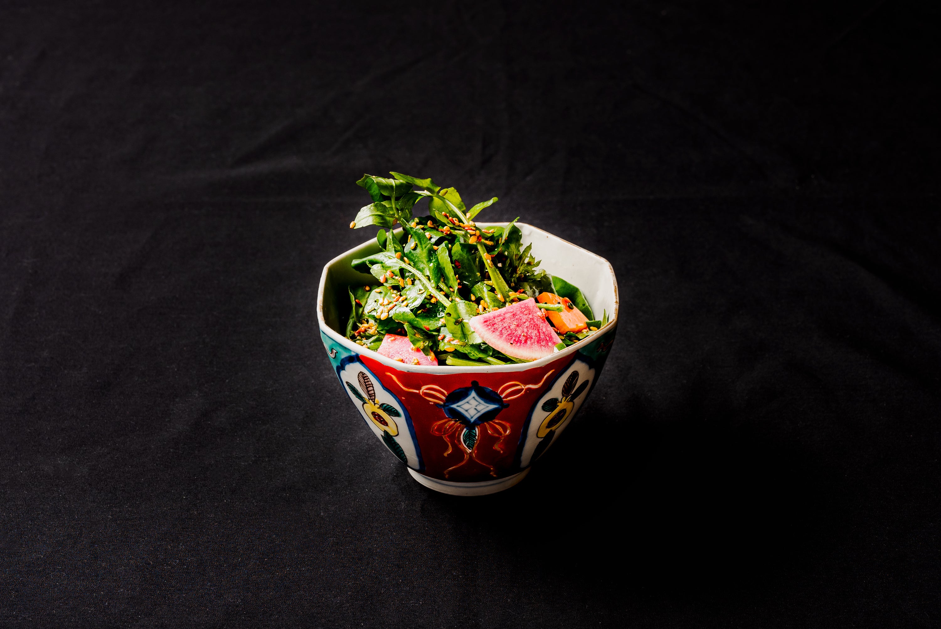とんかつには千切りキャベツが定番ですが、弎人では新鮮で栄養満点の旬の野菜サラダを提供いたします。