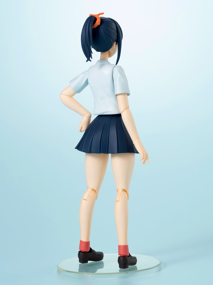 ポニーテール用の髪パーツ、半袖シャツ用の胴体、腕、スカートが付属しており組み替える事で再現可能。