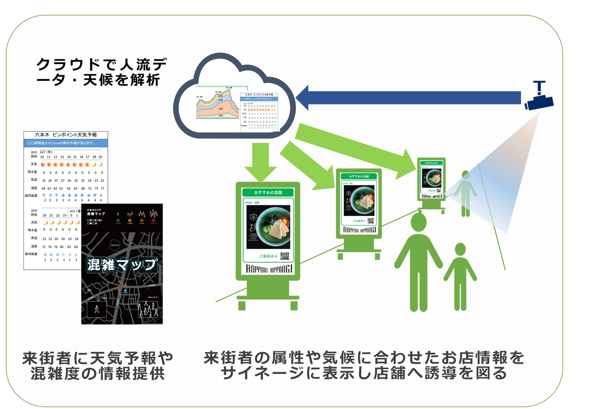 今年度は東京都の商店街デジタル化推進事業として、街路灯に搭載しているカメラから得た歩行者の移動方向や属性(性別・年齢)、さらにその時の時刻や天候を加味して、その時そこを歩いている方に適したお店を街路灯のデジタルサイネージからご案内する取り組みを,実証実験を経て2月1日より本格スタートいたしました。