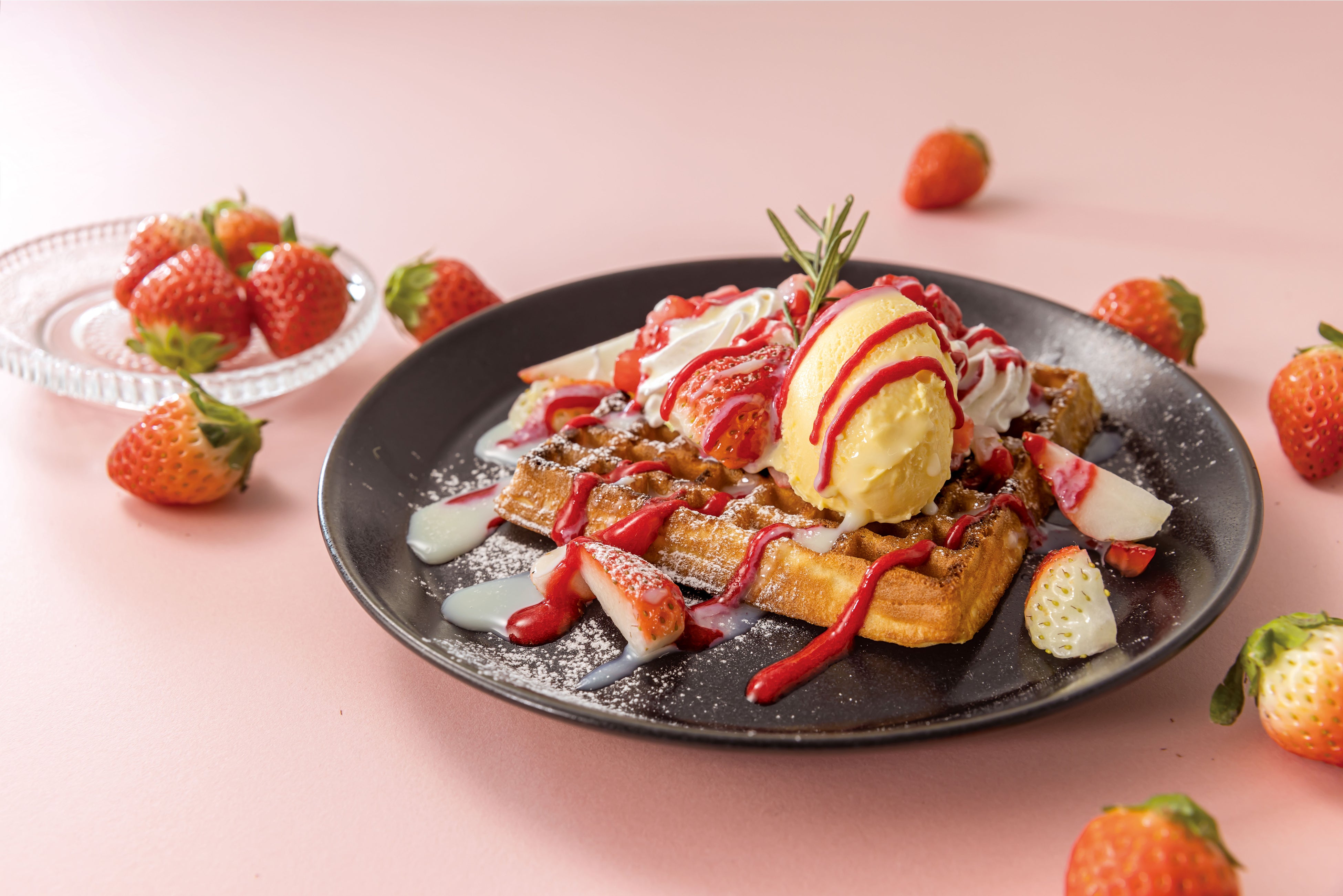 アメリカンワッフルにホイップクリーム、バニラアイス、いちごをトッピング。木いちごのピューレと練乳に絡めてお召し上がりください。