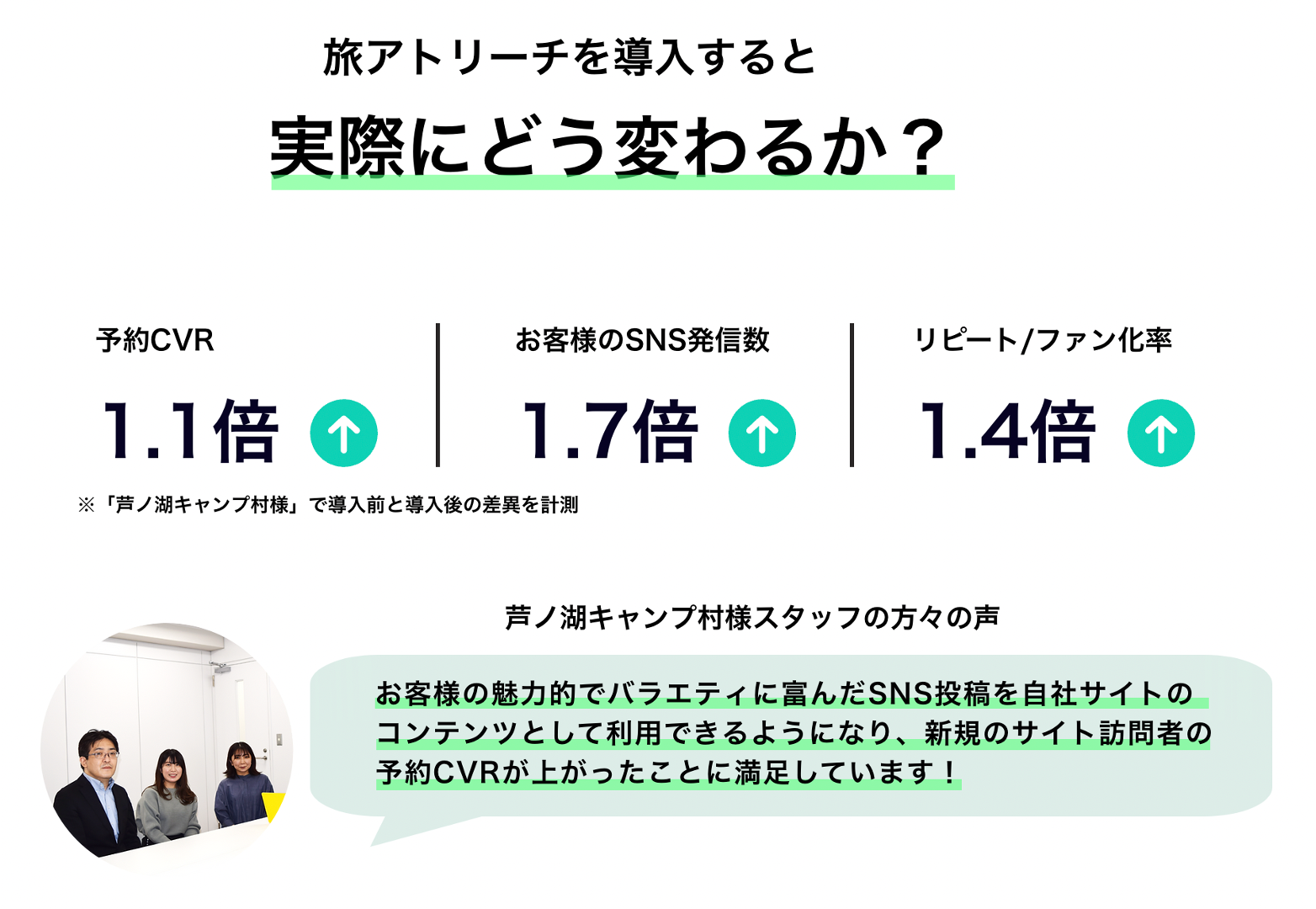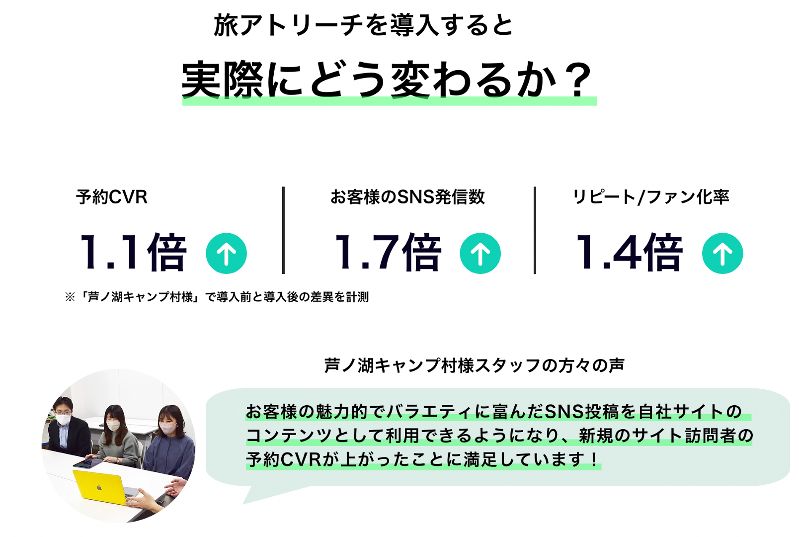 公式サイトに、「一般ユーザーの自然でリアルな投稿」を載せることでサイト訪問者により魅力が伝わり、予約・購入・問い合わせなどのコンバージョンアップにつながります。更に、公式サイトに掲載された投稿者は絆を感じリピート利用につながります。つまり、新規にも既存顧客にも効く施策となります。