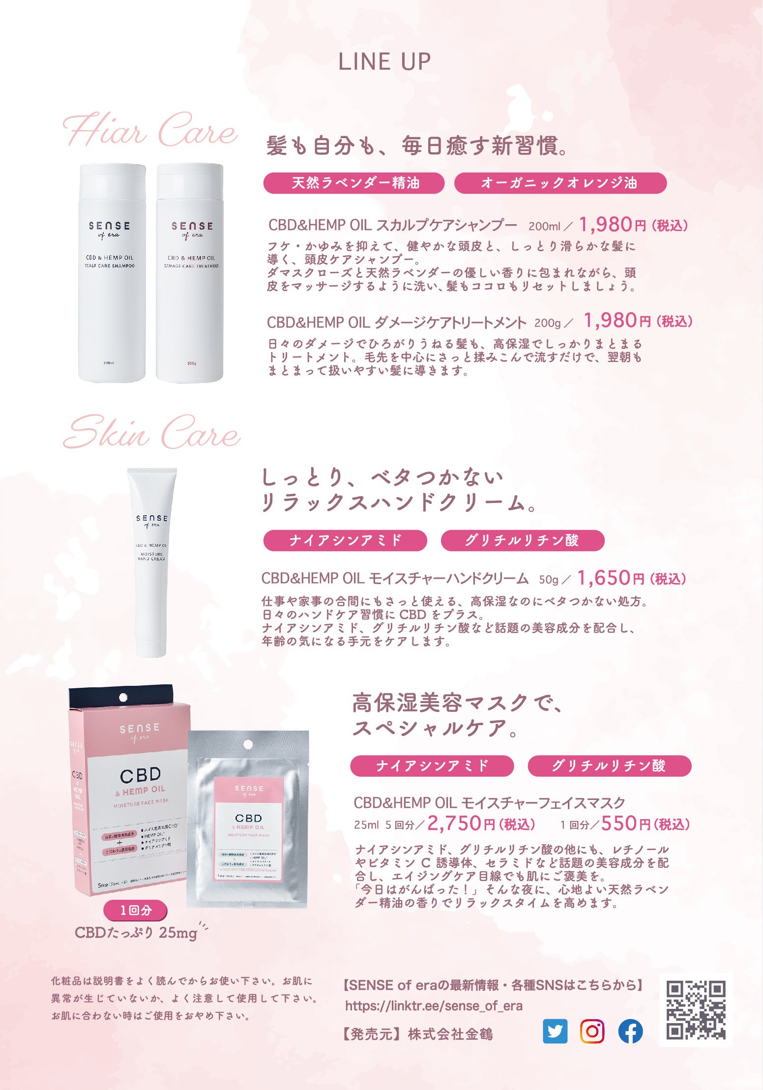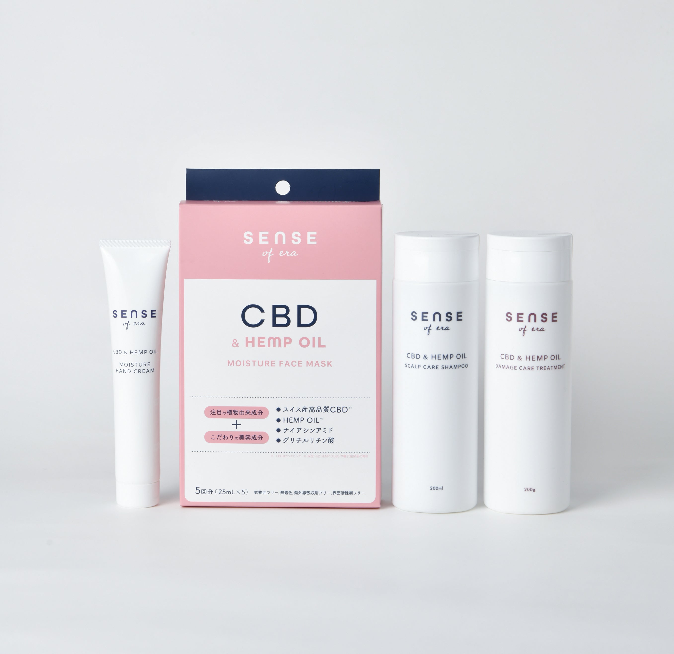 今世界が注目する植物性由来のCBDとこだわりの美容成分をミックスした、新時代の美容習慣「SENSE of era」の1stラインアップ、シャンプー、トリートメント、ハンドクリーム、そしてフェイスマスクが株式会社金鶴(所在地:東京都世田谷区)の公式ECサイトにて販売開始となりました。