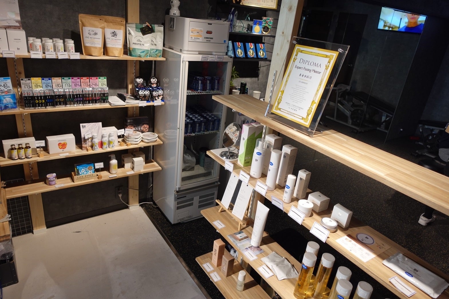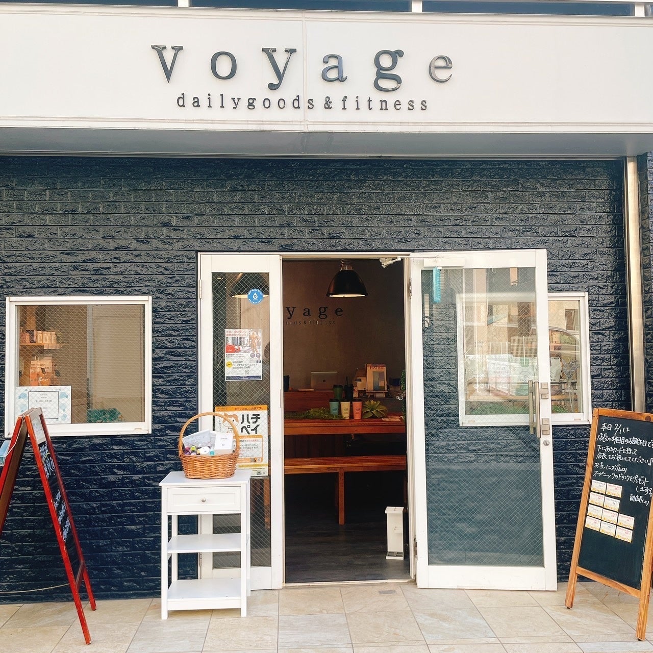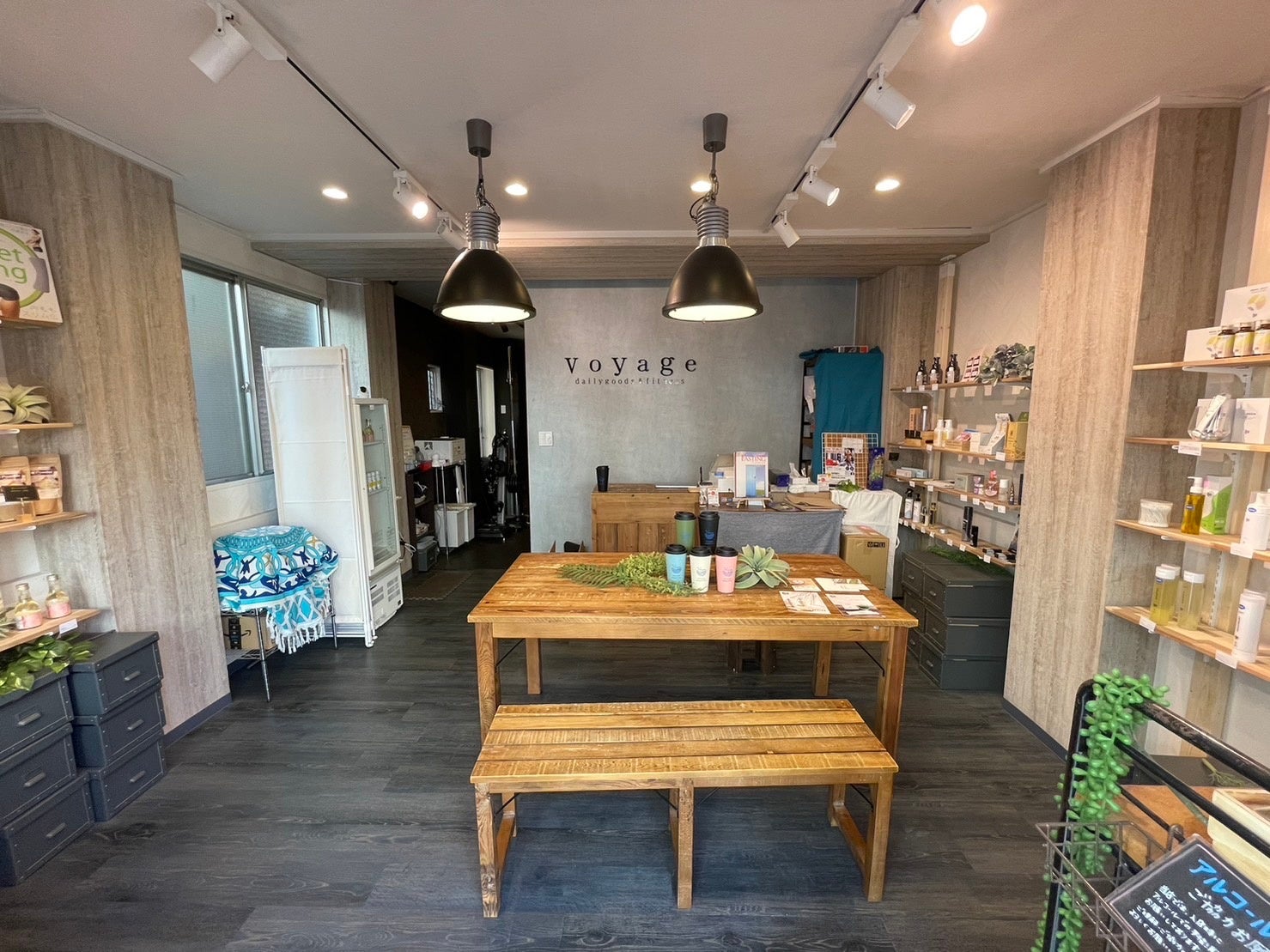 移転後は、落ち着いたグレーにvoyageのテーマカラーのブルーを取り入れたシックな店内としました。ジムエリアを拡大し、雑貨エリアはコンパクトになりました。ジムエリア拡大に伴い、トレーニング機器をさらに追加する予定。また、高タンパク質プロテインも導入しトレーニング後のプロテイン補給にも対応。今後はボディメイクの大会に出る人はもとより、生活の中に健康習慣を取り組みたい方向けのサプリメントなども仕入れる予定です。