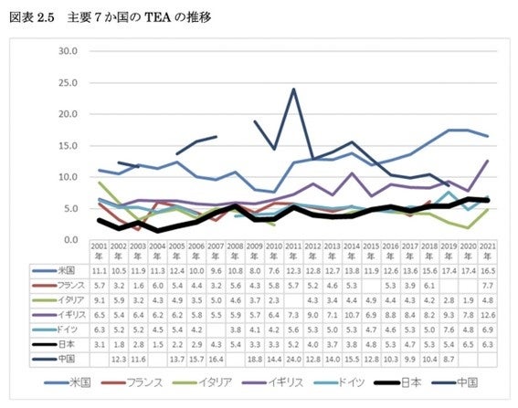 日本のTEA(起業活動指数)が、米国や中国と比較すると1/5ほどであることがわかる(太線が日本)
