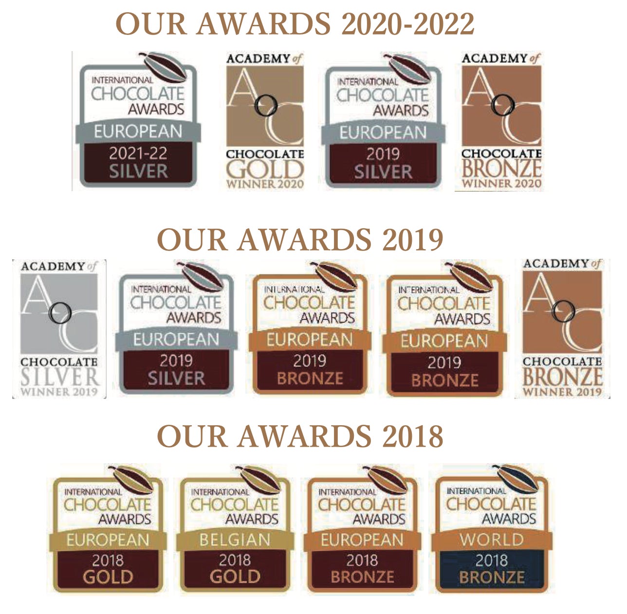 手間暇を惜しまず丁寧につくりあげたクオリティに対する評価は極めて高く、世界最高峰のチョコレートを認定するコンペティション「アカデミーオブチョコレート」(2020年)や、毎年延べ3000以上の作品がエントリーされる世界最大級のチョコレートコンテスト「インターナショナルチョコレートアワード」(2018年)などで金賞を獲得。毎年、数多くの国際的なコンテストで栄誉に輝いています。