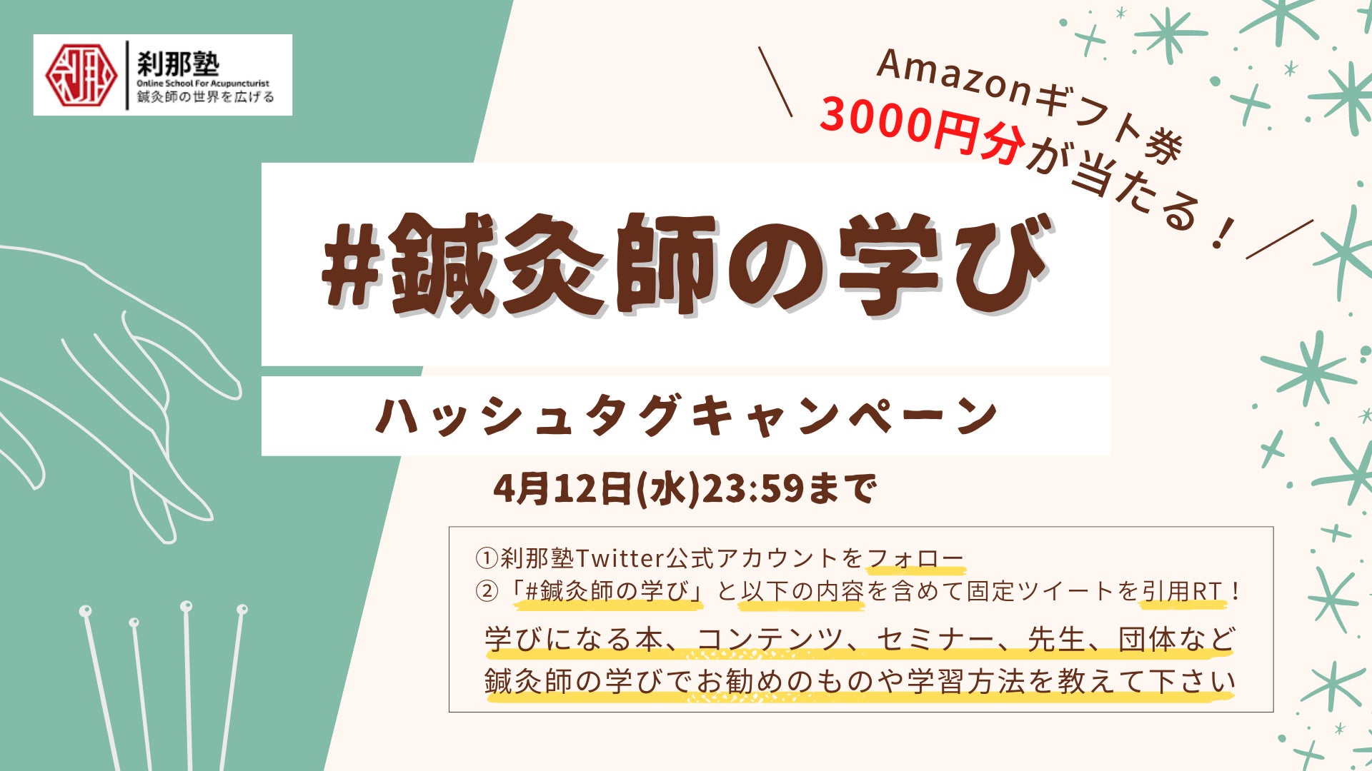 「刹那塾」は、会員数3000名突破を記念し、「#鍼灸師の学び」Twitterハッシュタグキャンペーンを実施中!抽選で10名にAmazonギフト券3000円分をプレゼント致します。