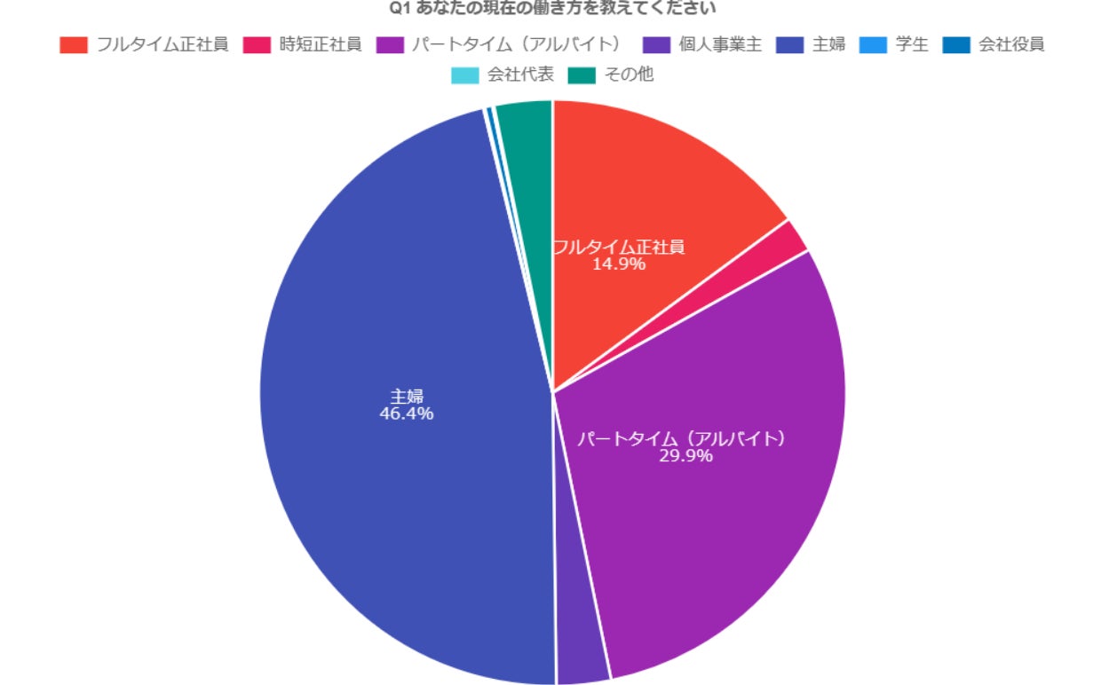 まず、子どもを持つ女性1,000人に「あなたの現在の働き方を教えてください」と尋ねたところ、「主婦」(46.4%)が一番多く、以下、「パートタイム(アルバイト)」(29.9%)、「フルタイム正社員」(14.9%)、「その他」(3.2%)「個人事業主」(3%)、「時短正社員」(2%)、以下「学生」「会社役員」「会社代表」はそれぞれ数名いらっしゃいました。