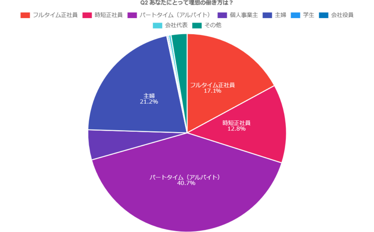 「あなたにとって理想の働き方は?」という問いに対しては、「パートタイム(アルバイト)」(40.7%)が一番多く、「主婦」(21.2%)、「フルタイム正社員」(17.1%)、「時短正社員」(12.9%)、「個人事業主」(4.9%)という回答が出ています。