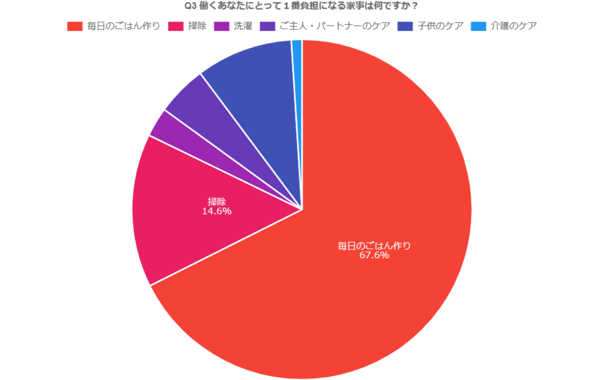 最後に、「働くあなたにとって1番負担になる家事は何ですか?」と尋ねたところ、「毎日のごはん作り」(67.6%)が一番多く、以下、「掃除」(14.6%)、「子どものケア」(9.2%)、「ご主人・パートナーのケア」(4.8%)、「洗濯」(2.8%)、「介護のケア」(1%)という結果となりました。