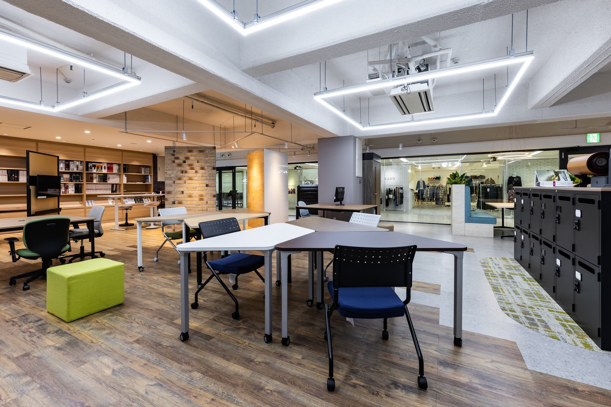 さらに、「様々な働き方との出会いの場」として、豊富に取り揃えた各種商材や内装材を実際に施工したらどうなるのか、お客様が実際に作りたいシーンやレイアウトを体感いただき、壁紙・床材・サインなどのサンプルを確認しながら試すことができる機能も備えました。