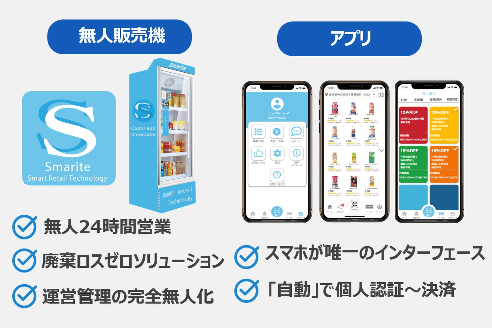 厚生労働省が定める「HACCP」に沿った衛生管理への対応に加え、特殊なアルゴリズム解析による物体自動識別技術により、ショーケースから取り出した商品を自動で識別しドアを閉めると決済アプリにて「自動」で決済して購入が可能な無人販売機です。国内初の無人小売基幹システムとして遠隔の温度管理や在庫管理などに加え、消費期限管理や売価の変更なども遠隔で管理できるシステムです。従来の自販機とは異なりパッケージの大きさや規格の制限なく陳列が可能です。