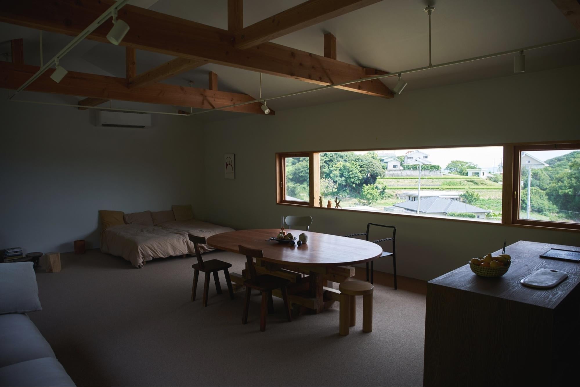 ゲスト棟の2階にある広々としたワンルームの客室には、置田と繋がりのあるクリエイターやセレクトしたこだわりの家具や調度品が並び、アートブックやデザイン書籍を中心としたライブラリーコーナーもご用意しています。海を見下ろせる大きな窓からは、ゆっくりと移り変わる景色を特等席でお楽しみいただけます。
