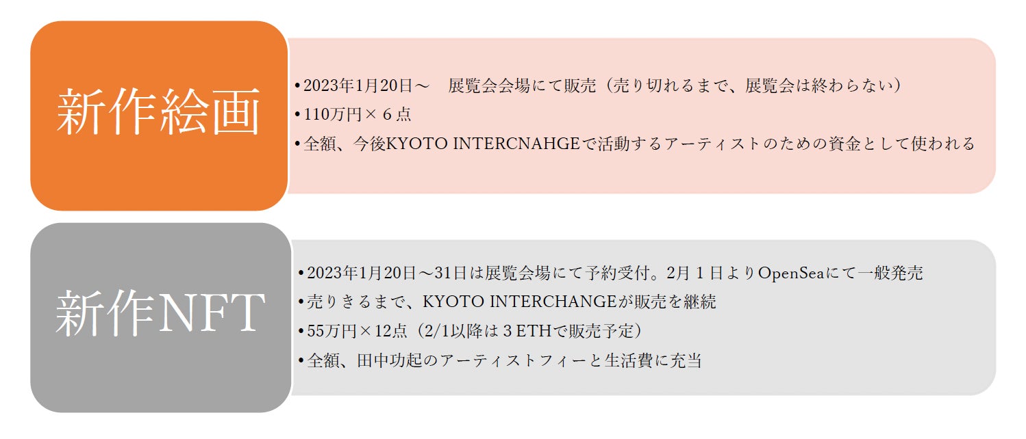 最後に、田中が初めて手がけたNFT作品《Infrastructural Cat》のシリーズ12点が2023年2月から販売されます。その売上が、絵画作品の販売で得られなかった田中自身の生活費およびアーティスト・フィーとして充当されます。こちらもその完売までKYOTO INTERCHANGEが販売を継続します。