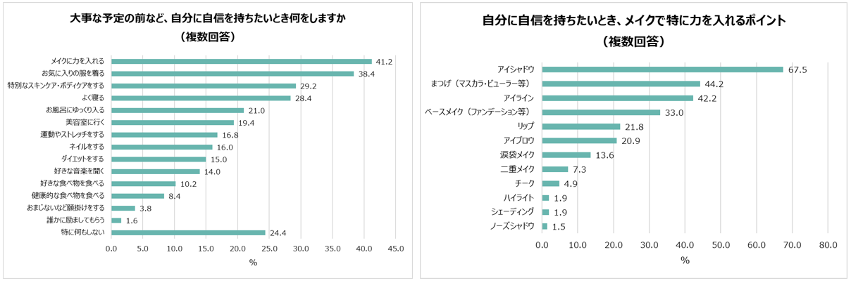 - 1.約7割の女性が、目元の調子で気持ちが変わる。調子が良いと「気分が晴れやかになる」人は約4割。自分に自信を持ちたいときは「メイクに力を入れる」。特に力を入れるポイントはアイメイク