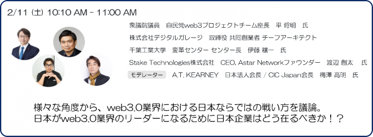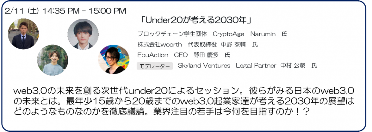 セッションのテーマは「NFT、Defi:オンチェーン分析における今後の動向」となっており、10日の15時10分より行われる予定です。