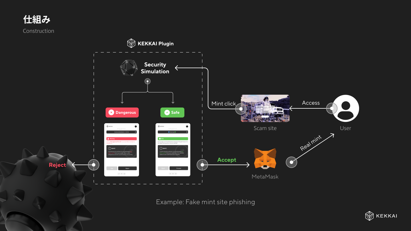 Metamaskなどのウォレットがトランザクションを実行する前に、KEKKAIがシステム内で取引をシミュレートし、結果を明示します。トランザクションの内容を整理すると共に、気づかず詐欺取引を実行してしまう危険性を防ぎます。