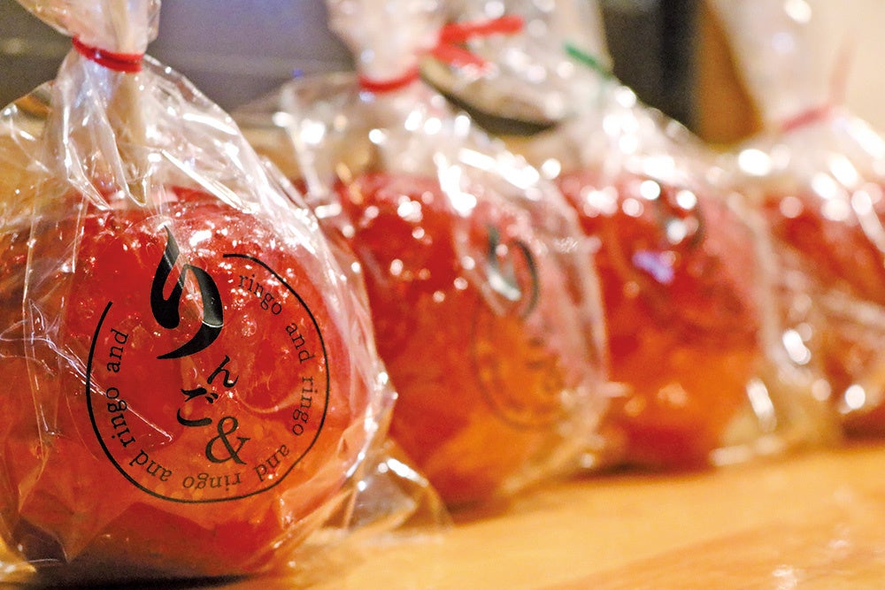 りんごだけでなく、いろいろな食材で作ることを革新した福留店長。季節ごとにさまざまなフルーツ飴が登場します。現在展開しているメニューはりんご飴・プレーン(550円)、りんご飴・シナモン(650円)、いちご飴(500円)、ブドウ飴(550円)、トマト飴(450円)。これからは、りんご飴のホワイトチョコや意外な食材を使った飴も登場予定。
